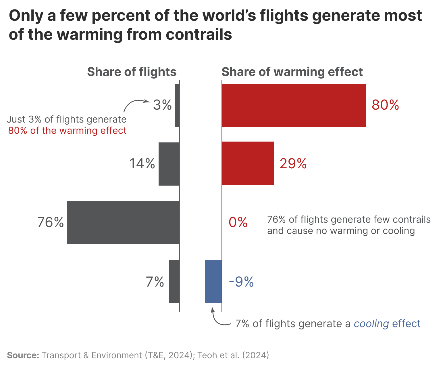 Most flights — three-quarters of them — barely generate contrails at all and cause no warming or cooling.