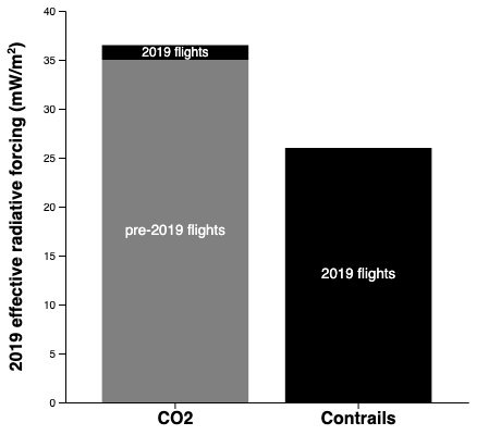 When we think about the climate impacts of aviation, then, most of the warming from CO2 emissions is not due to the emissions this year, but the cumulative effect (which persists) over the past 70 years. But for contrails, the warming impact is only really from those created very recently (hours to days); the small temperature response decays over months to a few years.