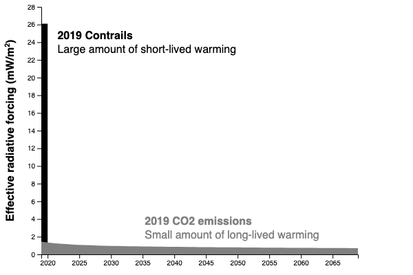 Contrails have a strong “effective radiative forcing” effect. This basically measures the net change in energy flow at the top of the atmosphere: and that change in energy flow dictates how much warming is needed at the surface to offset it. But, this warming effective is very short-lived. If we were to stop contrails today, the warming effect would disappear within a day or so.