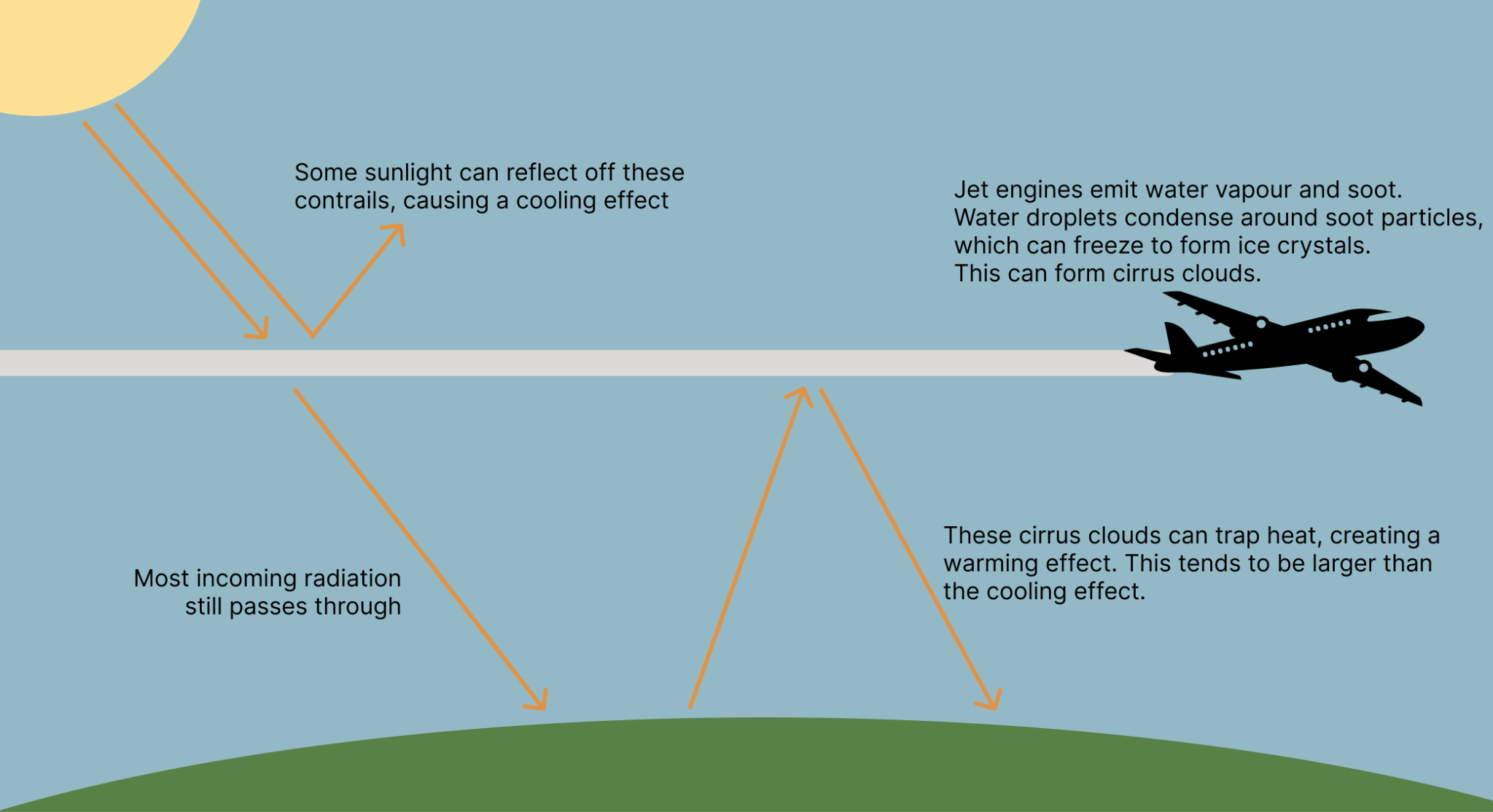 Most sunlight, though, does pass through, and outgoing irradiation then gets trapped by the cirrus clouds. This has a warming effect, which tends to be larger than the cooling one, so on net, contrails cause warming.