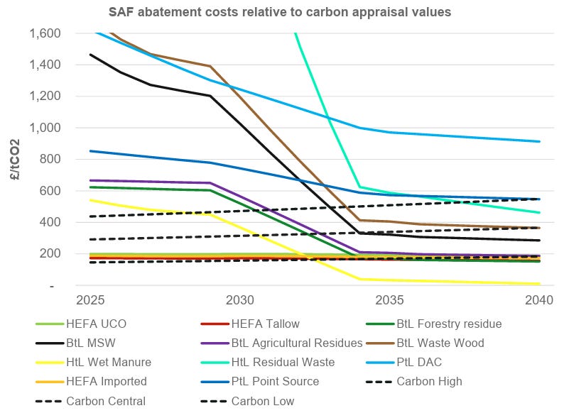 Here’s an ugly, but useful graph from the UK Government’s cost-benefit report on SAFs.