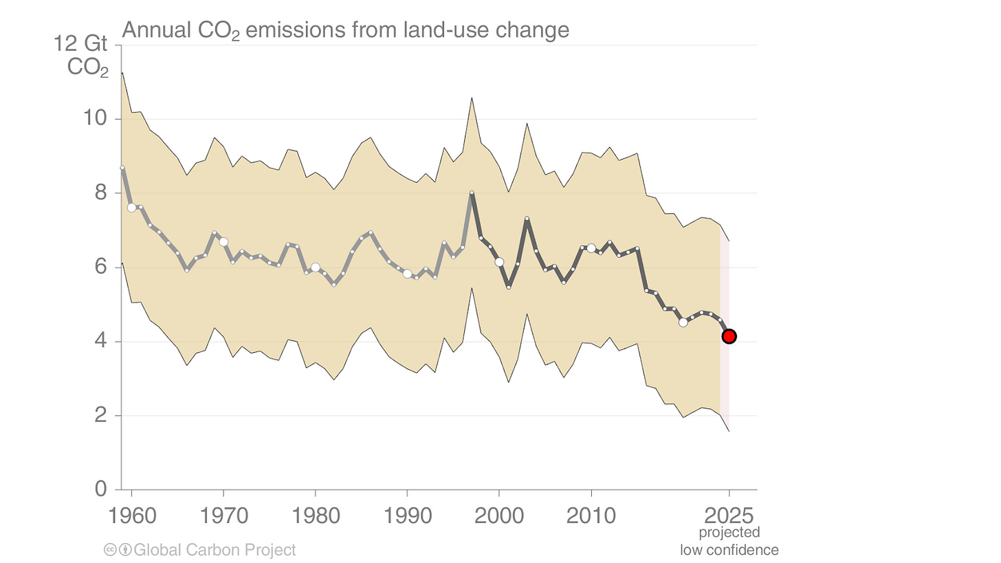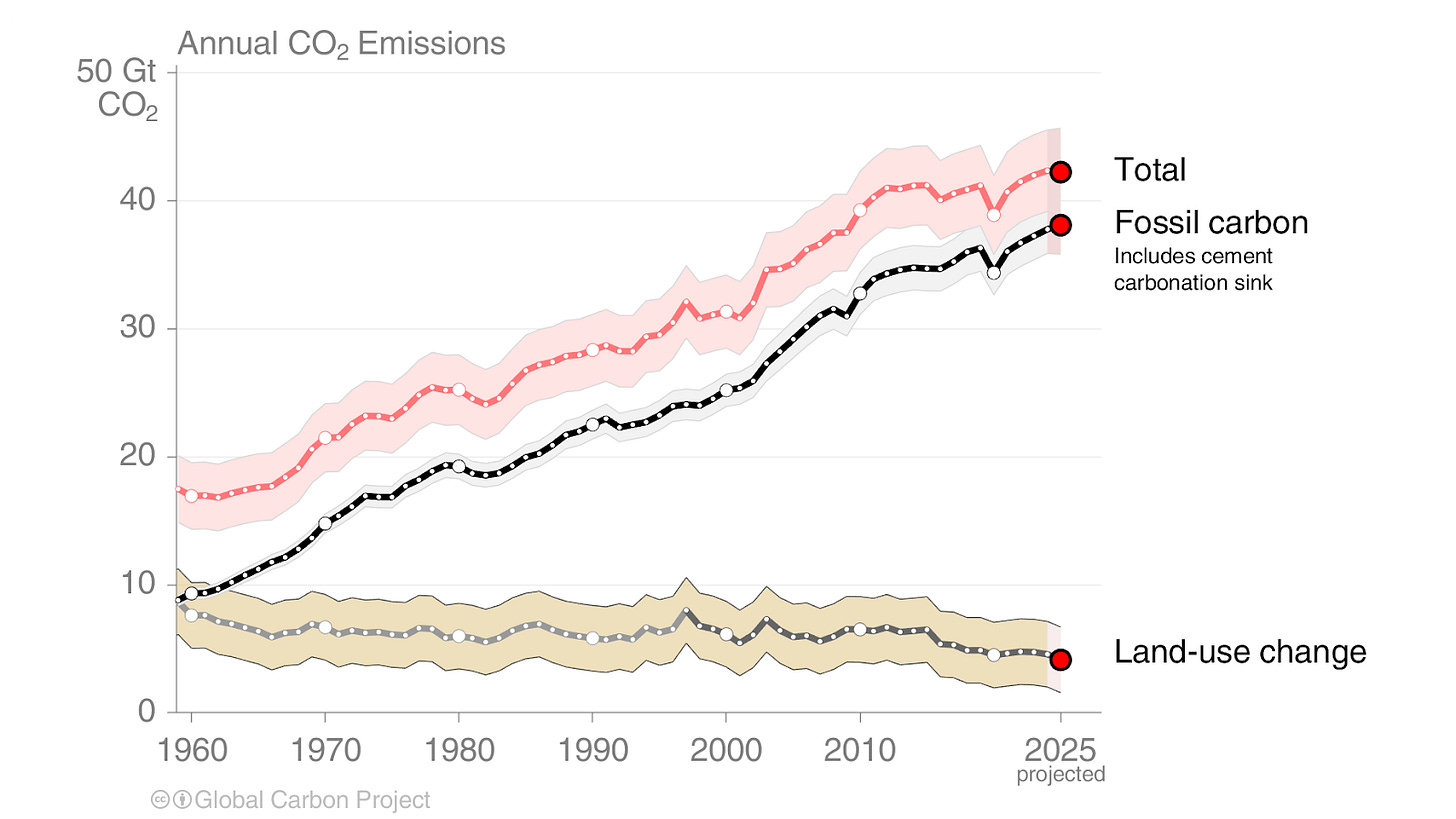 In 2025, GCP projects that fossil emissions increased by around 1%, while those from land use change decreased. You can see this in the chart below.