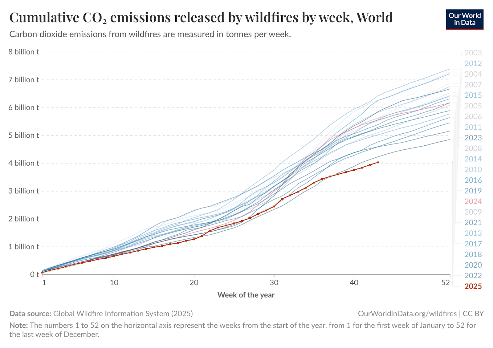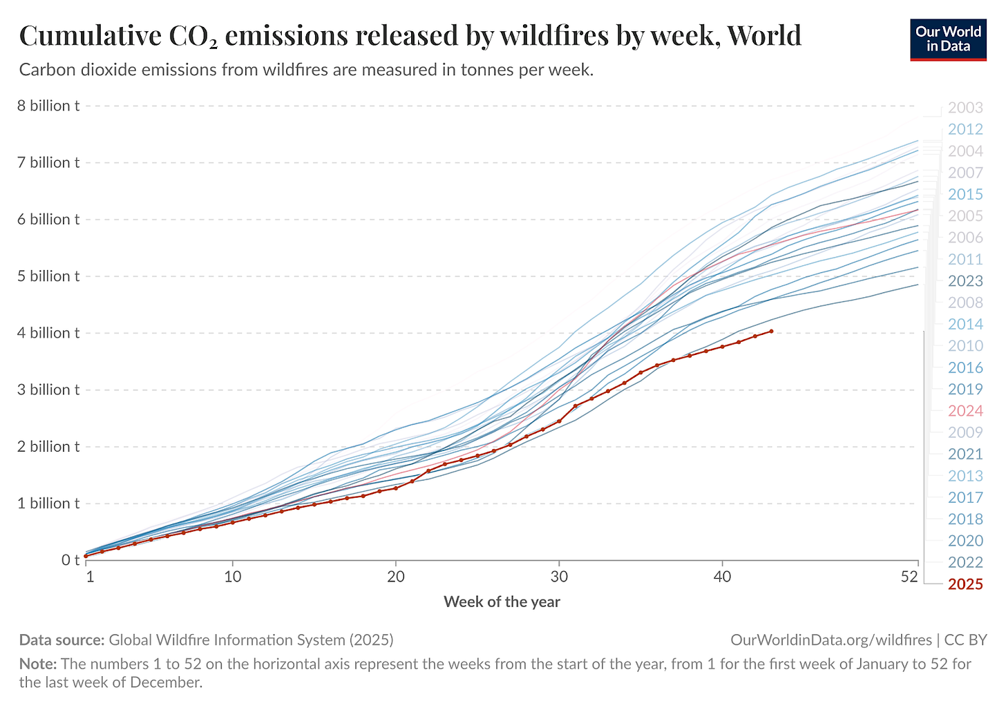 Global wildfires have been less intense than in previous years, both in terms of area burned and carbon emitted. In the chart below, you can see that 2025 emissions are tracking below previous years based on data from the Global Wildfire Information System.