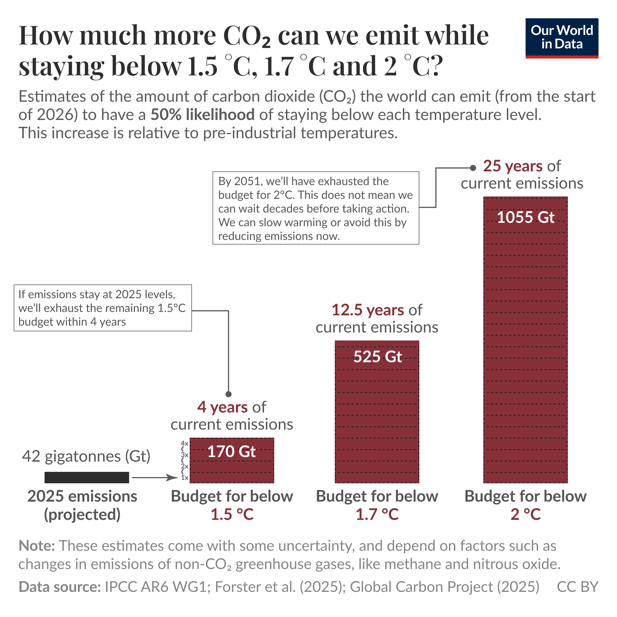 Below, I’ve made a chart showing the estimated remaining “carbon budget” — from Forster et al. (2025) and the IPCC AR6 report — to keep global temperatures below certain levels. This is based on a 50% likelihood of doing so: if we wanted to guarantee we stay below it, the budgets are obviously smaller.