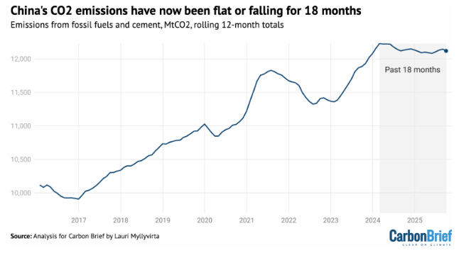 “After the third quarter of 2025, it is clear that the plateau or slow decline of China’s CO2 emissions that started in early 2024 continues.